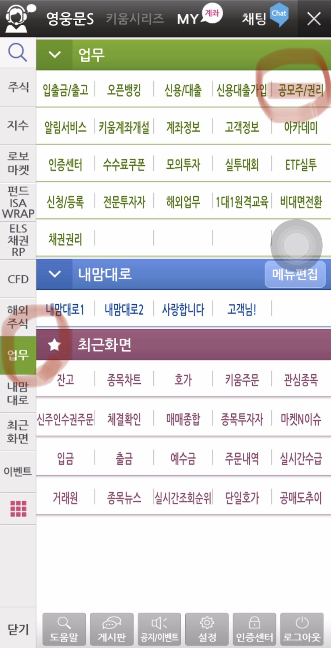 1. 영웅문s에 로그인 한다. 맨 밑에 자주색 {메뉴}를 누른다.