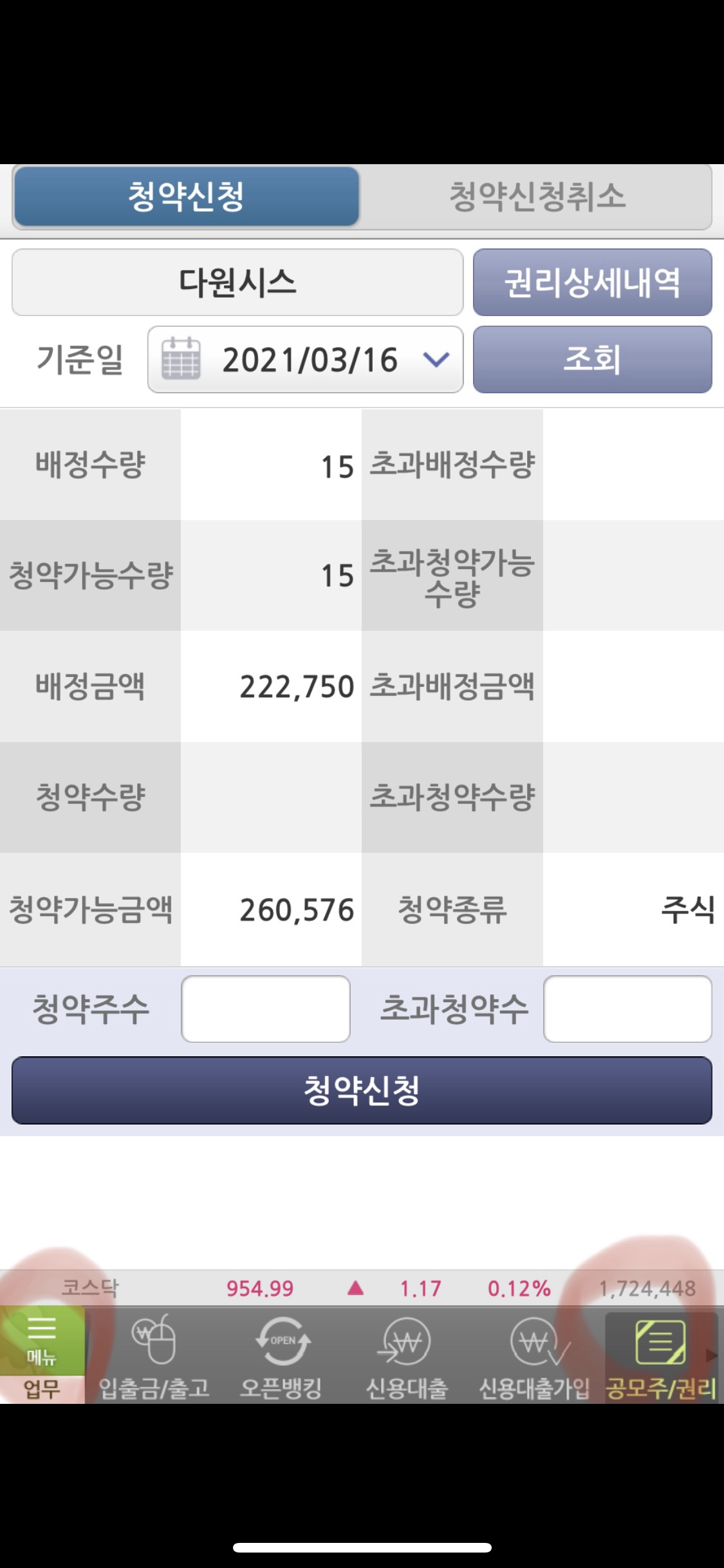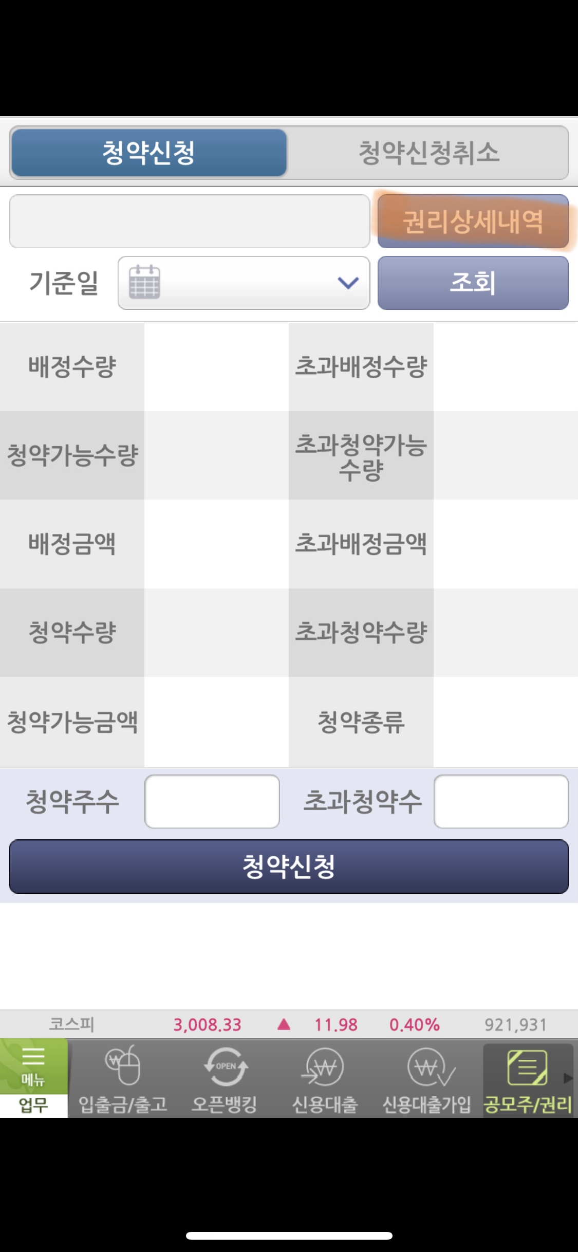 2. 이 화면이 뜨면 맨아래 오른쪽 {공모주/권리} 누르면 - {유상청약} 누릅니다.