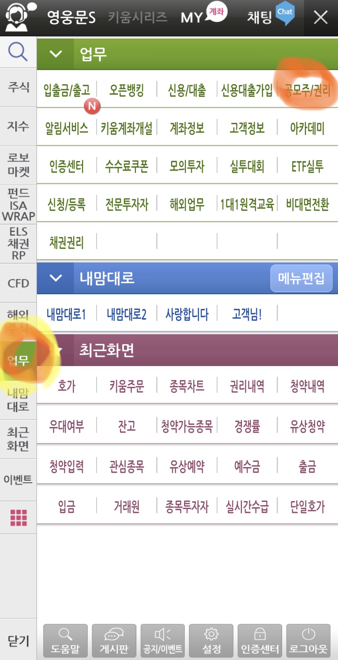 1. 영웅문을 켜고 맨아래 왼쪽 {메뉴}를 누르면 다음화면이 뜹니다. {업무} 누르고 {공모주/권리} 선택