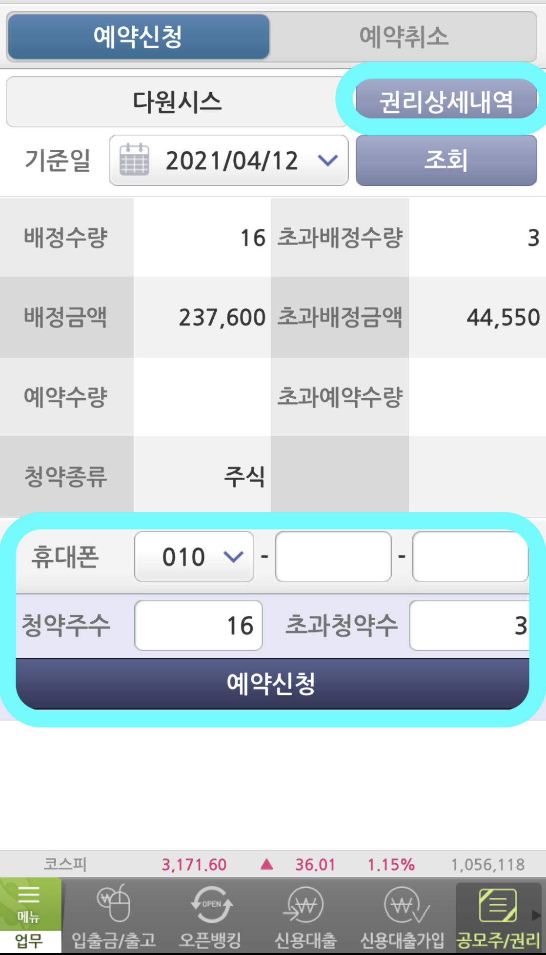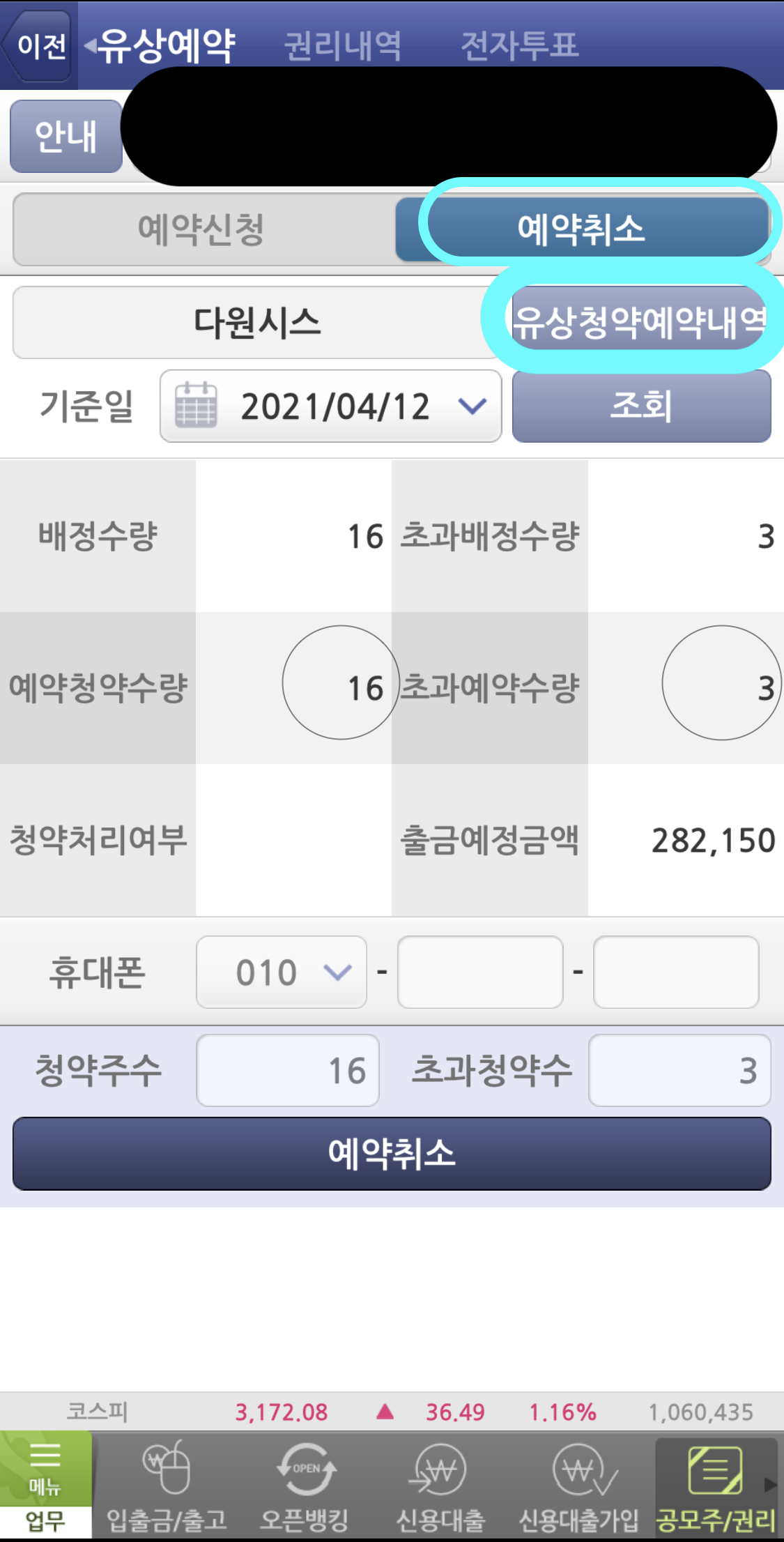 {유상청약예약내역} 눌러서 {다원시스} 클릭