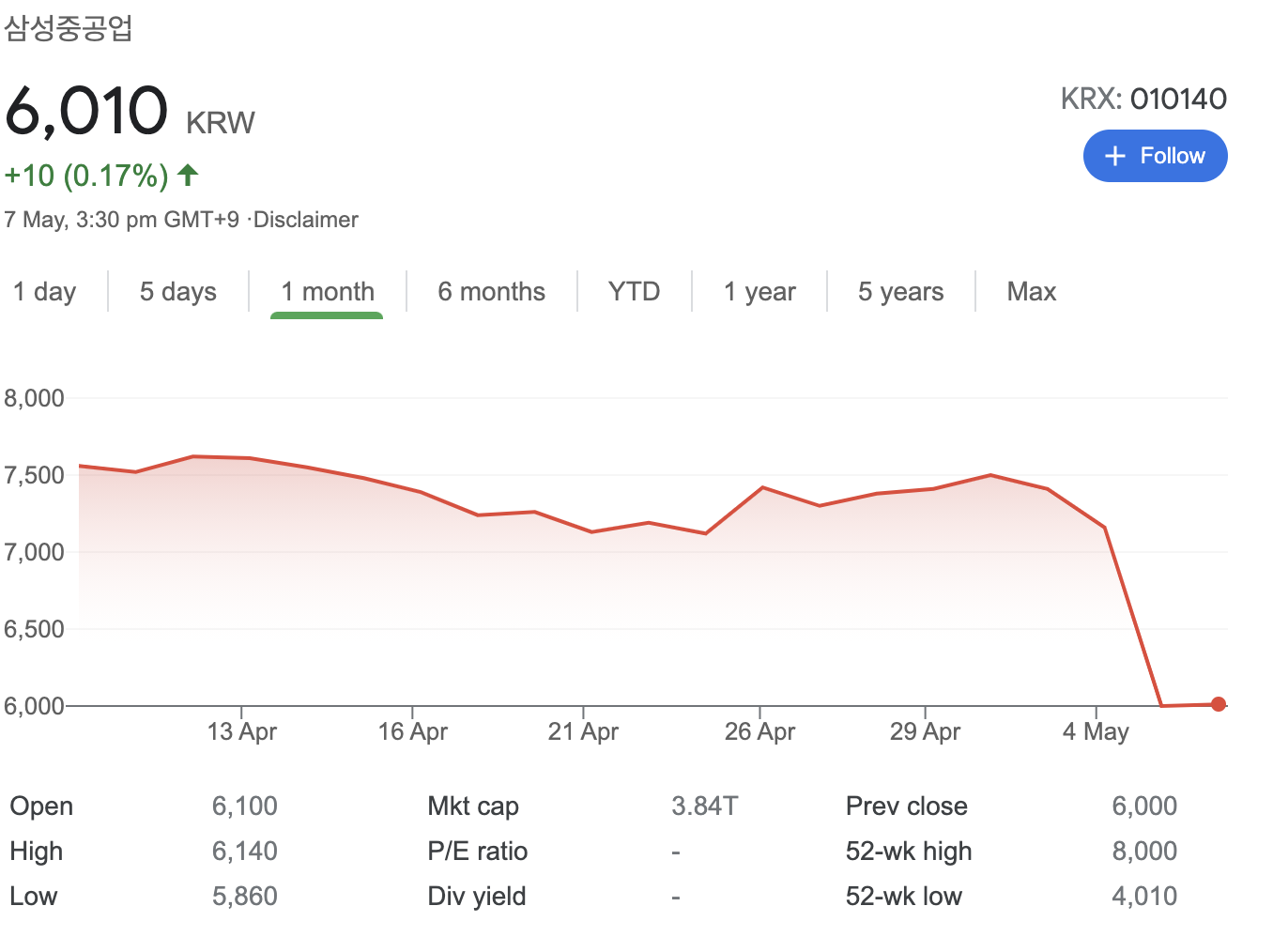 출처 대신증권 리포트 어닝쇼크로 하락한 (2021.05.06) 삼성중공업이 오늘(5/7) 0.17%정도 오른모습